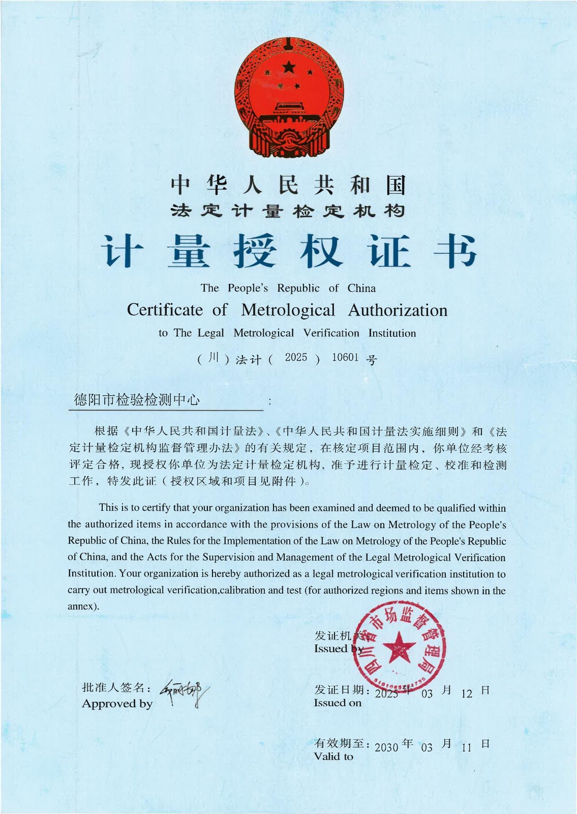 德阳市检验检测中心 授权证书及授权证书附件